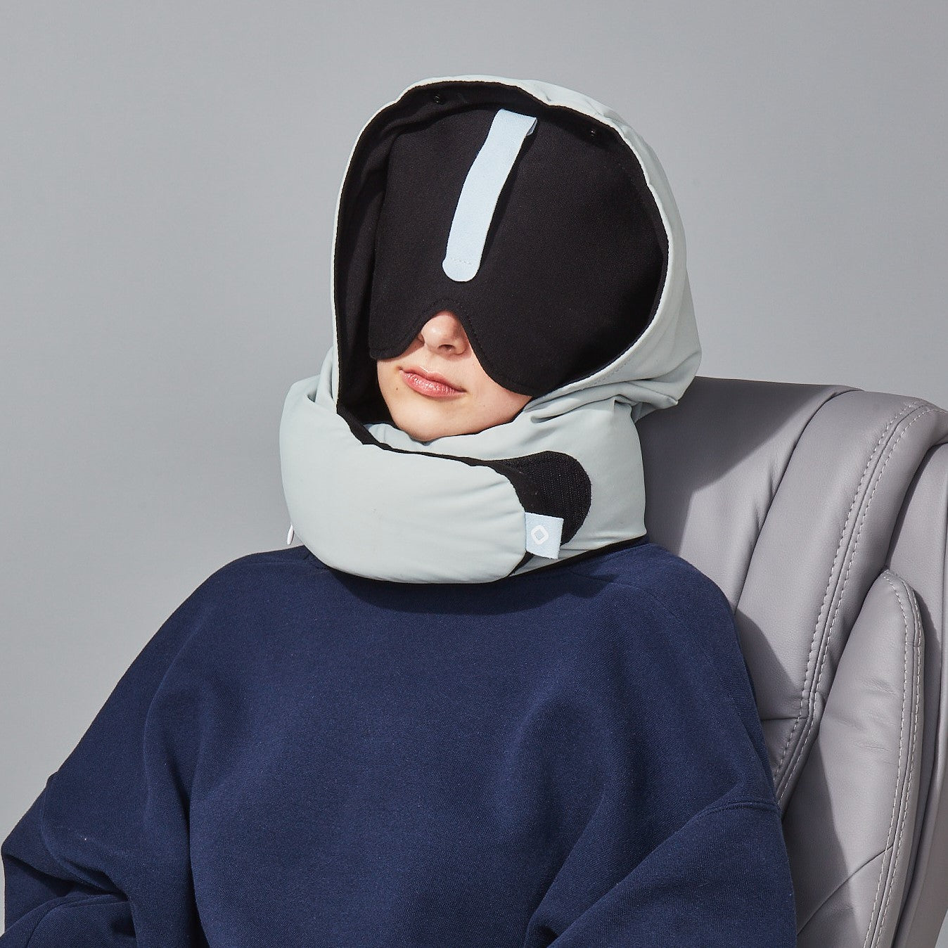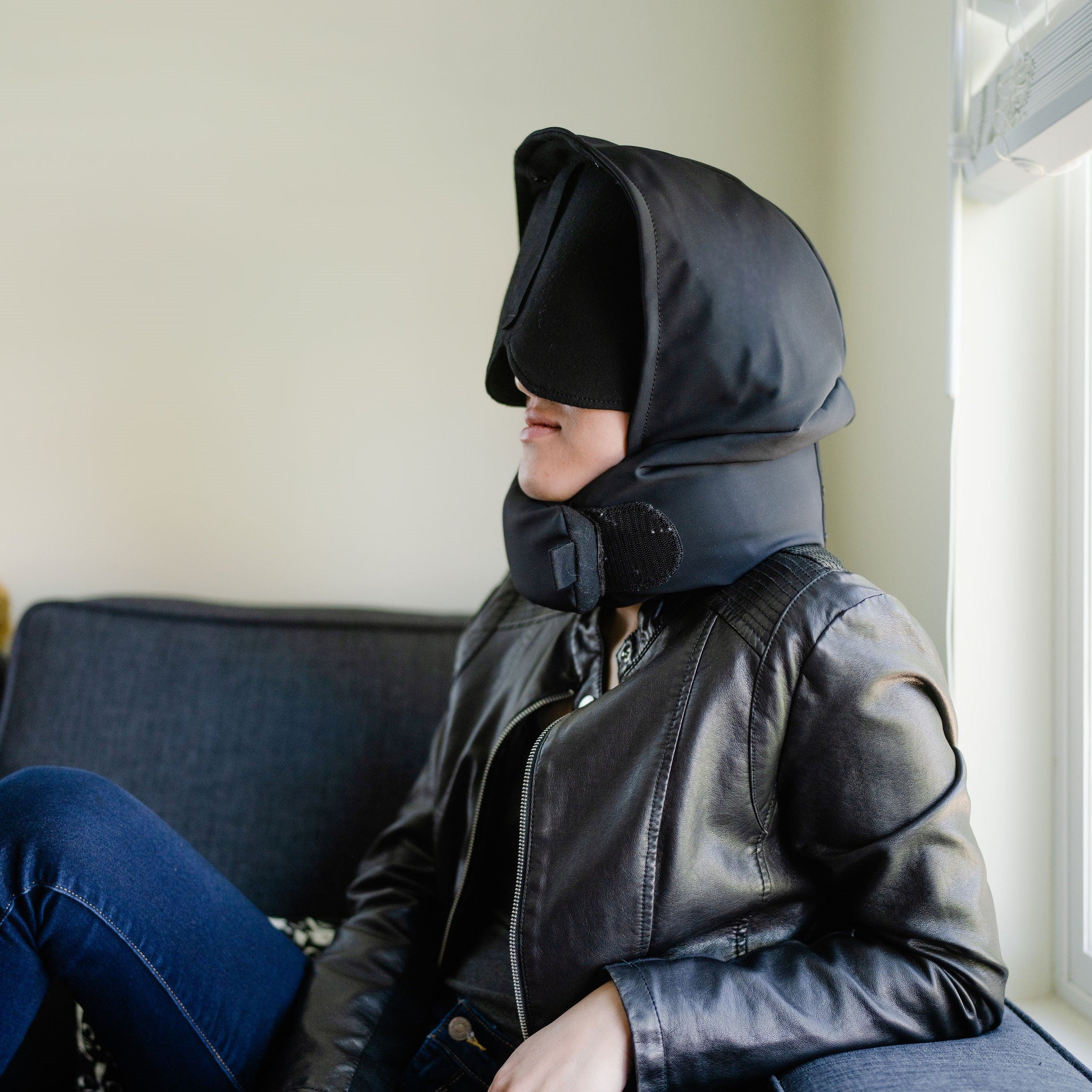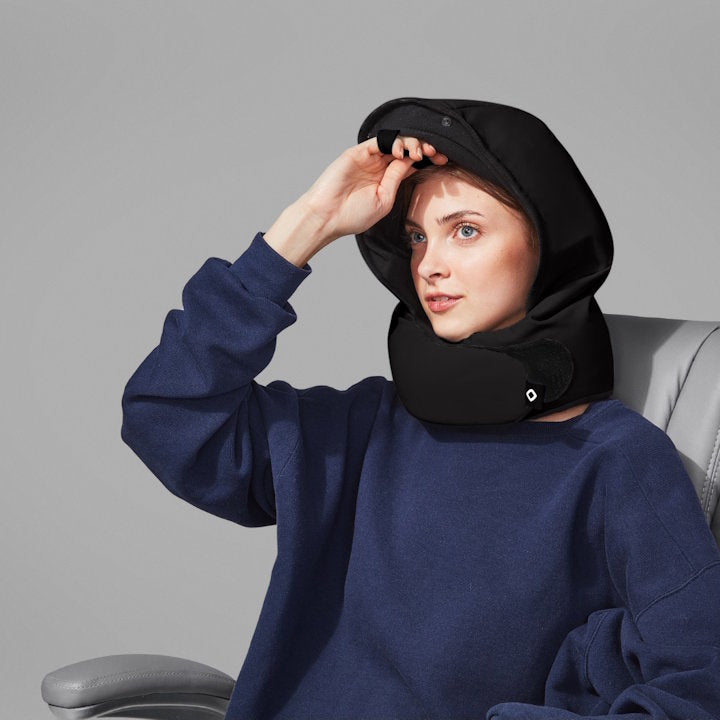 2. Pull the hood over for more privacy and pillowy support on the sides of your head
